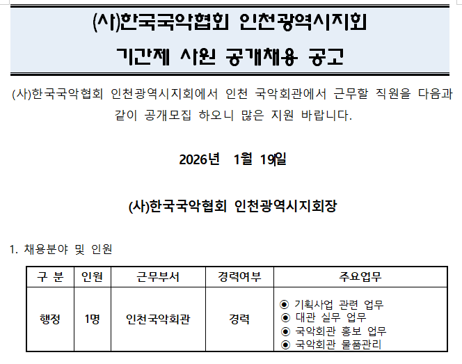 [채용공고] 인천국악회관 기간제 사원 채용 공고