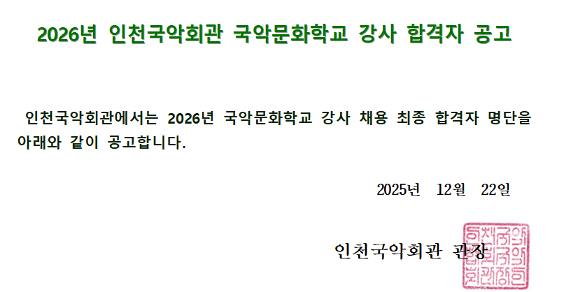 2026년 인천국악회관 국악문화학교 강사 합격자 공고