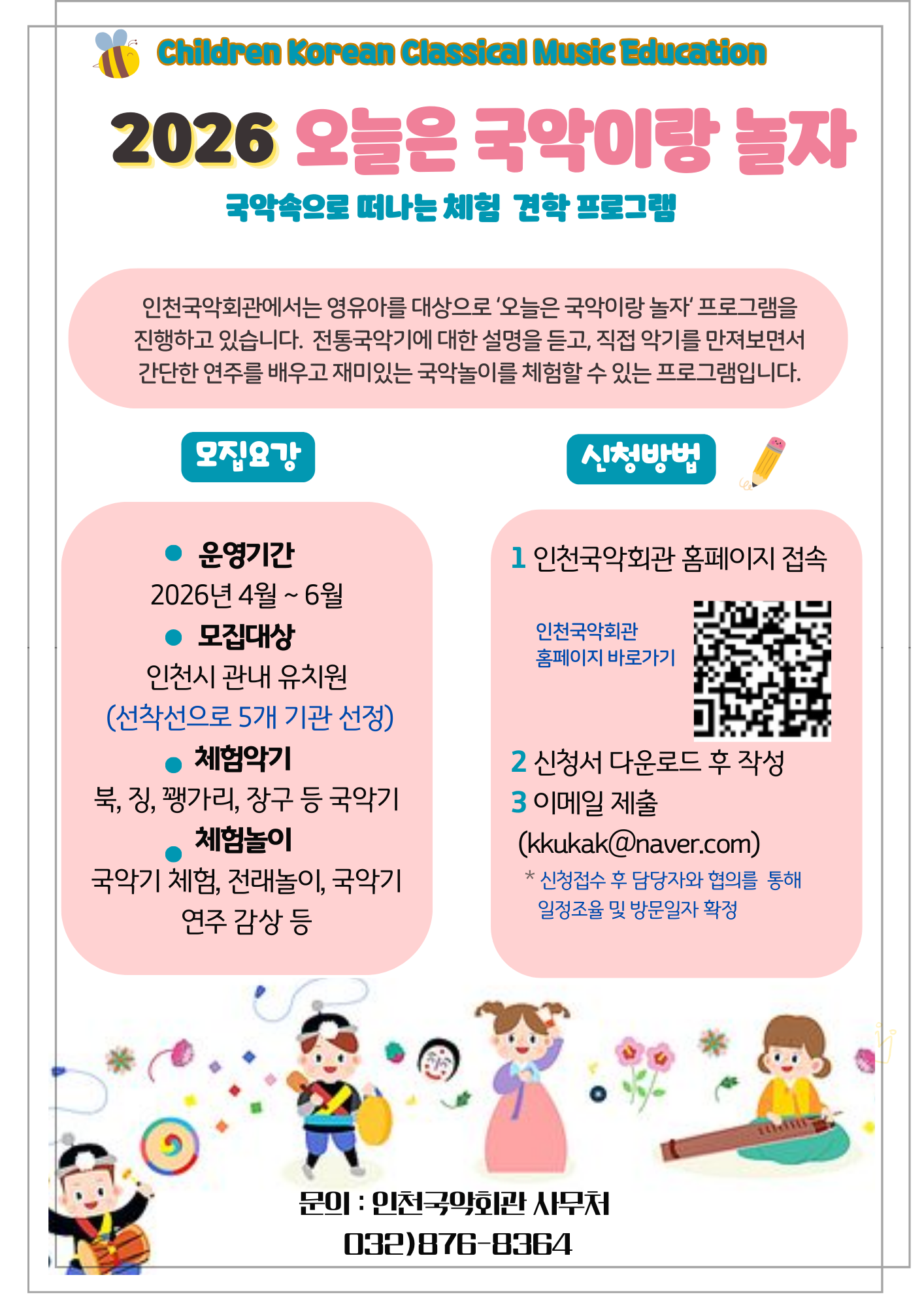 국악회관에서는 영유아를 대상으로 ‘국악이랑 놀자’ 프로그램으로 전통국악기에 대한 설명을 듣고, 직접 악기를 만져보면서 간단한 연주와 국악놀이를 배워 볼 수 있는 체험프로그램을 운영합니다.