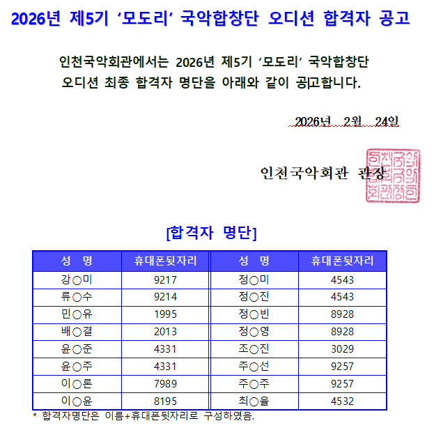 2026년 제5기 '모도리' 국악합창단 오디션 합격자 명단